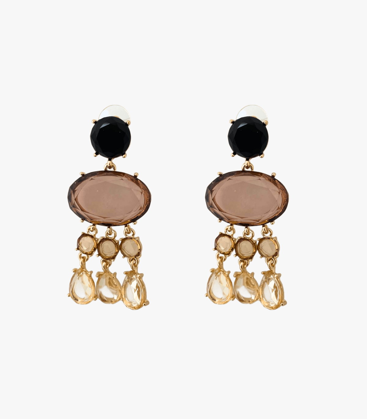 Raffinati ed eleganti, questi orecchini pendenti sono realizzati con una combinazione di pietre sfaccettate nere, cristallo beige ovale e luminosi pendenti a goccia trasparenti. La struttura in metallo dorato valorizza le pietre, donando luce e movimento al gioiello.