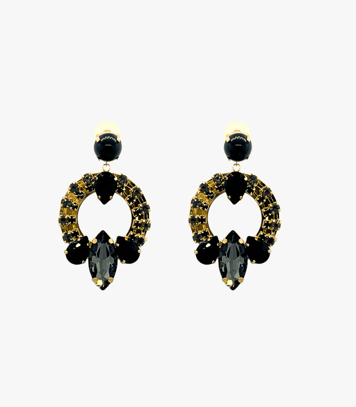Realizzati con una montatura dorata e arricchiti da cristalli neri a taglio rotondo e ovale, regalano luminosità e carattere ad ogni look.